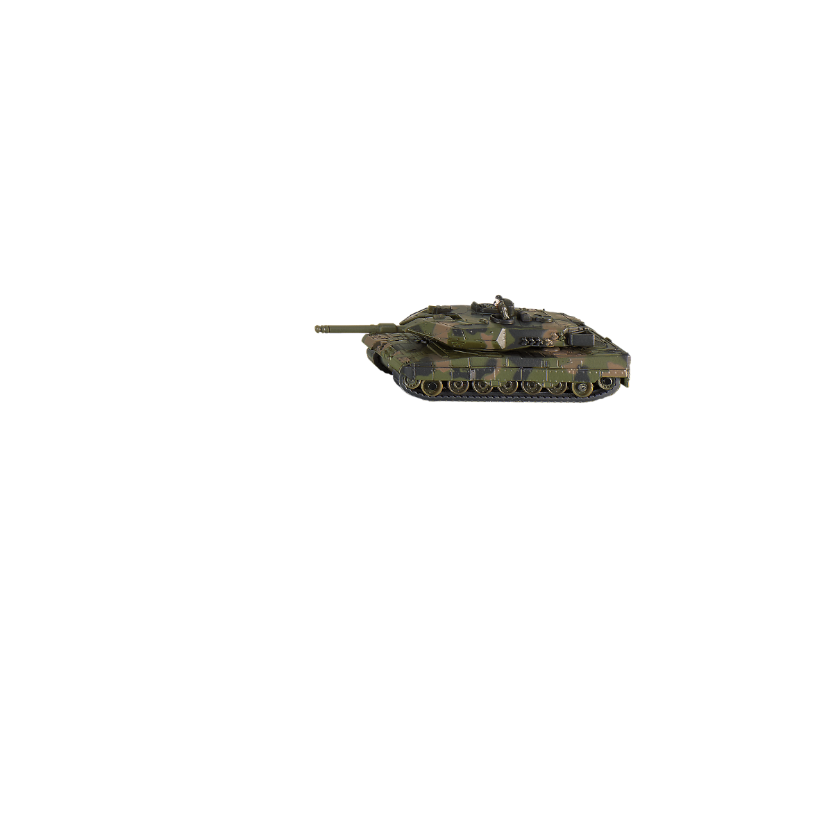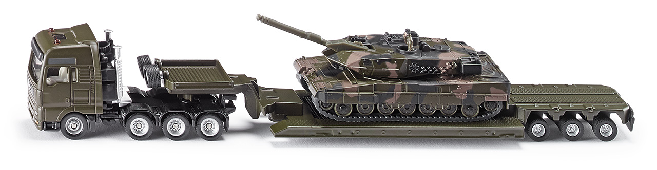 Autentyczna reprodukcja oryginału. Matowe wykończenie wojskowego kamuflażu. Słynny czołg Leopard jest przewożony na 4-osiowym transporterze. Możliwość odłączenia przyczepy. Model SIKU oprócz perfekcyjnego wykonania i dbałości o szczegóły, jest świetną interesującą, bardzo trwałą i wytrzymałą zabawką.