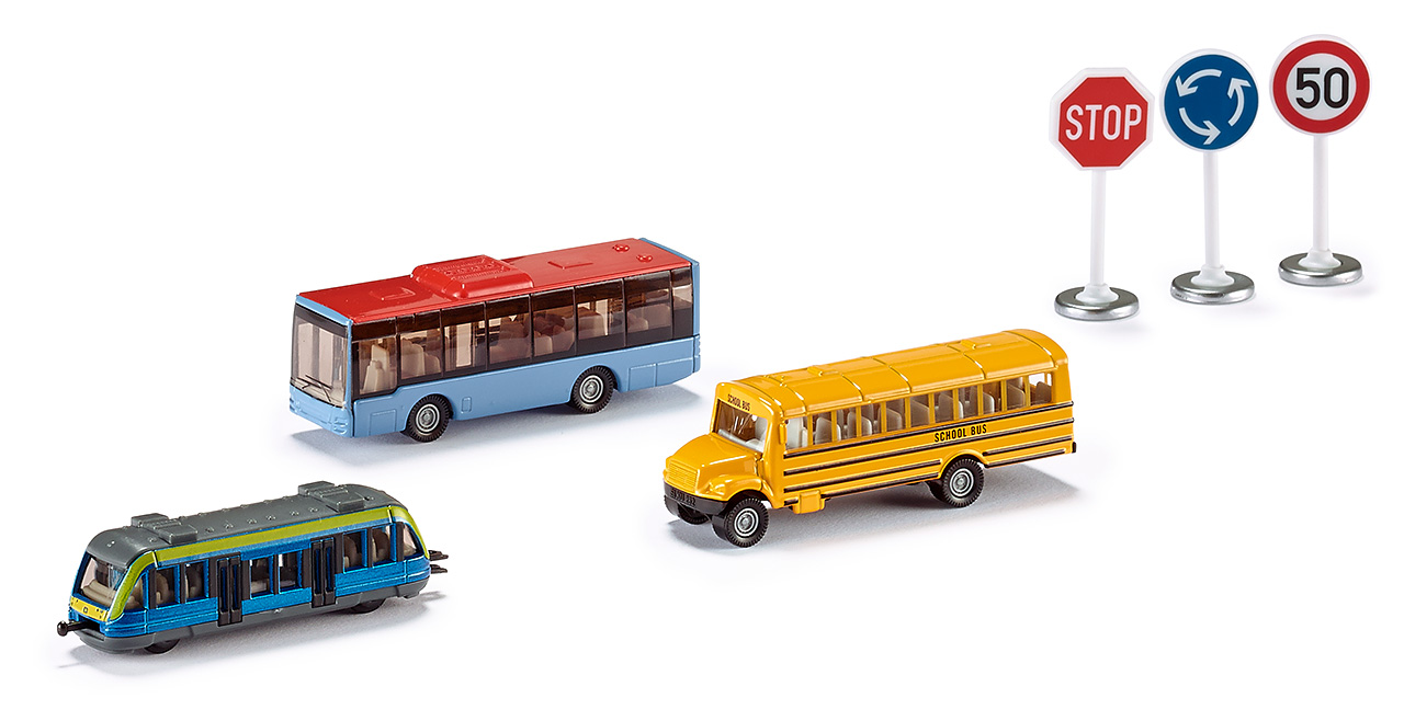 W skład zestawu wchodzą: tramwaj, autobus miejski, autobus szkolny oraz 3 znaki drogowe. Doskonały pomysł na prezent dla dziecka lub uzupełnienie kolekcji modeli SIKU.